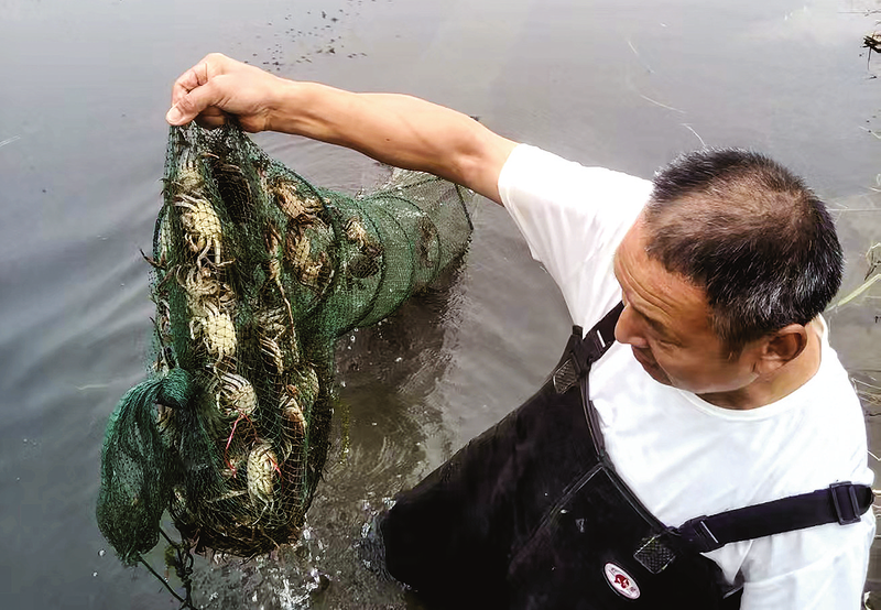 工人劉尚青在試養(yǎng)塘里查看大閘蟹長勢