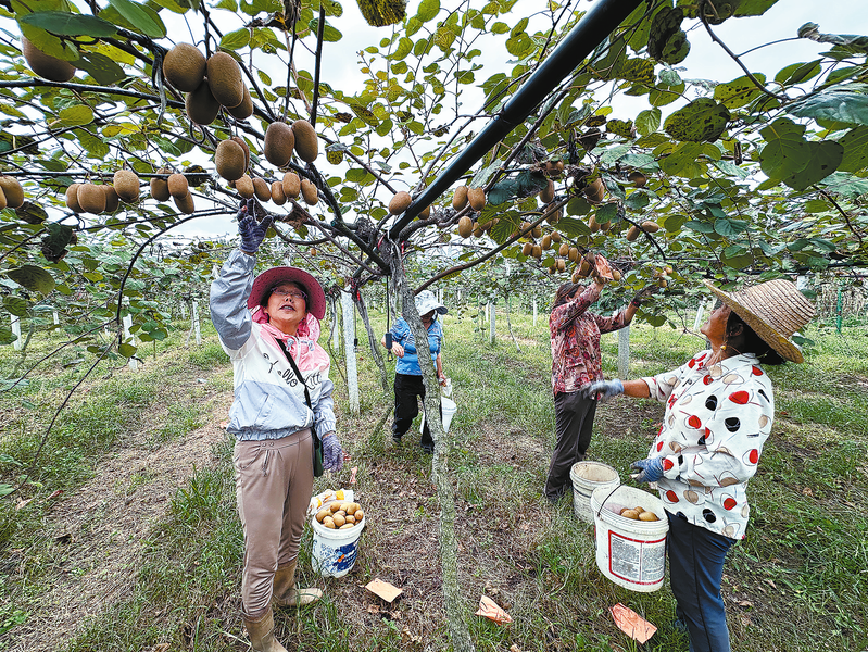 9月15日,在商南縣富水鎮(zhèn)王家莊村的種植基地里,工人正在采摘獼猴桃。該基地栽種有徐香、金桃、金艷、G3等多個品種的獼猴桃210畝,目前已經(jīng)進(jìn)入豐產(chǎn)期。預(yù)計今年產(chǎn)量可達(dá)到100噸,年產(chǎn)值80萬元,直接帶動周邊群眾穩(wěn)定增收。 (本報記者 胡 蝶 攝)