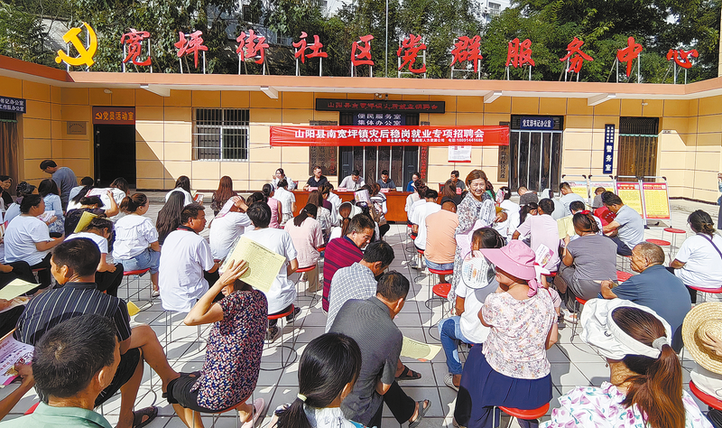 本報訊 (通訊員 張 斌)為進(jìn)一步拓寬受災(zāi)群眾就業(yè)增收渠道,助力災(zāi)后恢復(fù)重建,8月27日,山陽縣人社局、就業(yè)服務(wù)中心、蘇通旺人力資源公司聯(lián)合南寬坪鎮(zhèn)在寬坪街社區(qū)召開災(zāi)后穩(wěn)崗就業(yè)專項招聘會。