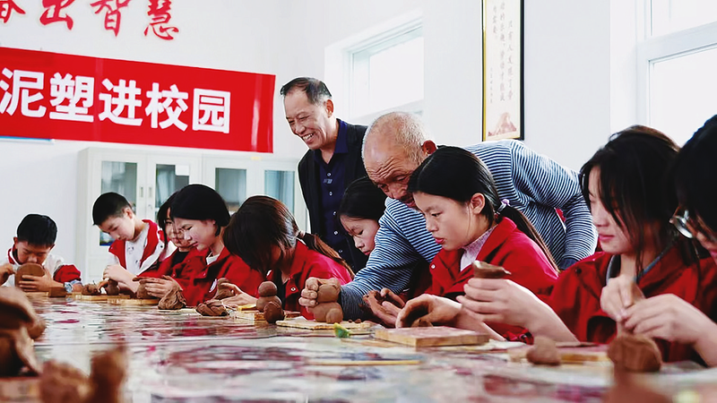 △山陽(yáng)縣縣級(jí)非遺項(xiàng)目“西照川泥塑”傳承人李光玉教授學(xué)生制作泥塑。