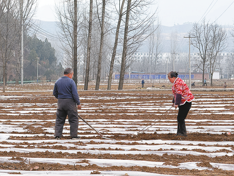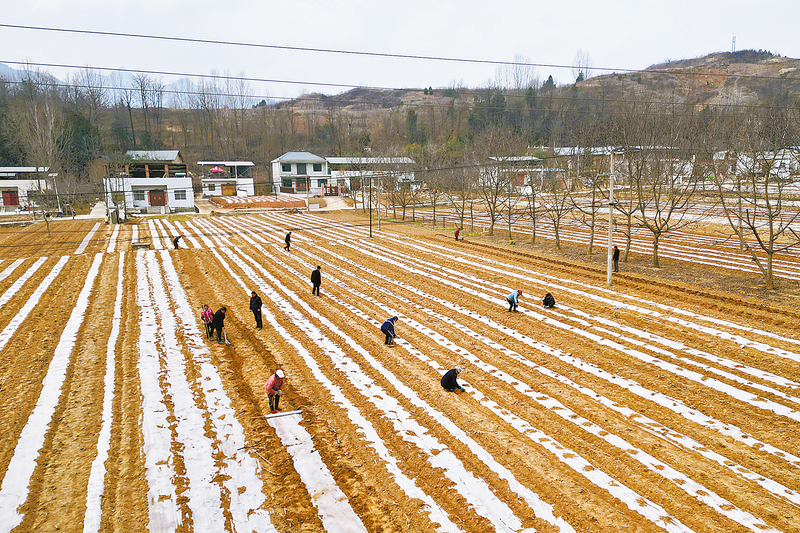 村民正在給土豆覆膜