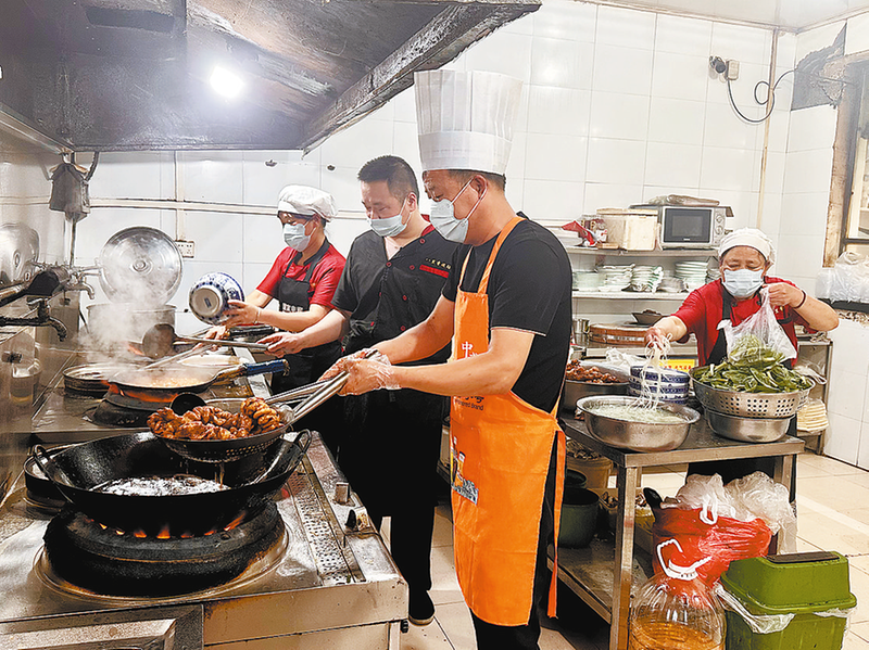 “做燒腸,需要很吃苦?!卑死锵銦c店的一位廚師周娥說。她是商州區(qū)板橋鎮(zhèn)人,來店里已經(jīng)兩年多了。目前,已經(jīng)基本能夠燒制燒腸,但還不會第一個環(huán)節(jié)鹵腸子。像這樣炎熱的夏天,她也需要中午