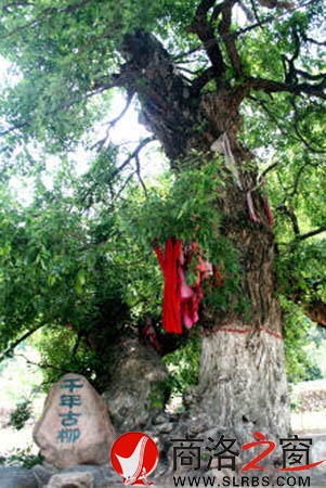 在丹鳳縣巒莊鎮(zhèn)中南村有一顆千年古柳,相傳是在很早時從安徽老家遷移至此的先祖?zhèn)兯玻ǘ嗉易谧V記載)。目前該樹根徑達2.6米,高20.8余米,同株分枝,枝繁葉茂,蒼勁有力。分開的兩株主桿相擁相依,一株屈曲延伸,一株徑直聳天,給人以向心力和親和力的感覺。古老的樹干皺皺巴巴,上面生長層層青苔和雜木藤蔓。這些無不為樹齡的古老做了很好的見證。當?shù)刈孀孑呡吶税言摌洚斪龊椭C吉祥的象征,視它為神樹、靈樹。大多剛剛出生的小孩就會被大人們抱來磕頭認親,披紅掛匾,認個干娘干爸干爹干奶什么的,目的就是圖個健康吉祥。據(jù)估算,該樹的干子干孫不下數(shù)百人。