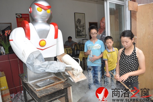 本網(wǎng)訊 近日,洛南縣一家餐館推出“機(jī)器人刀削面”,引來了諸多好奇的目光和絡(luò)繹不絕的食客。據(jù)經(jīng)營者介紹,削面機(jī)器人是他花費兩萬元從北京購買的,因這位“伙計”削出的面長短薄厚均勻、口感勁道,吸引了眾多食客。(冀希亮/攝)