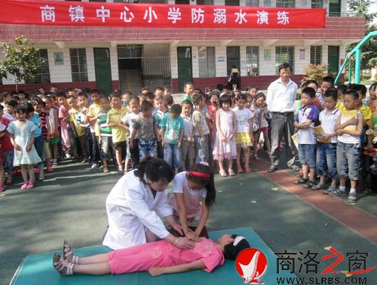 本次演練共分為三個環(huán)節(jié):第一,由學(xué)校主管安全工作的彭書武副校長進行夏季安全知識輔導(dǎo)學(xué)習(xí),特別強調(diào)了夏季防溺水工作的重要性;第二,由校醫(yī)張醫(yī)生對學(xué)生游泳容易造成溺水傷亡事故的原因以及溺水時如何緊急求助、自救進行了詳細的講解。并安排學(xué)生進行了模擬練習(xí)。第三,擬設(shè)在三種情況下學(xué)生進行求救、互救、自救的防溺水實踐演練。第一種情境是有兩名學(xué)生去游泳,一名被水溺后另一名向旁人發(fā)出求救演練;第二種情境是一名同伴被水溺后,另一名同伴用竹竿進行互救的演練;第三種情境是在游泳的過程中發(fā)生抽筋等不利情況下自救演練;第三,在張醫(yī)生手把手的指導(dǎo)下,學(xué)生輪流觀看對溺水者進行急救處理演練,然后個別同學(xué)扮演搶救者實踐對溺水者進行胸外心臟按摩、清理溺水者口鼻內(nèi)污等。