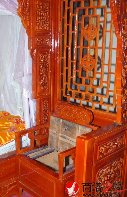這張古床看上去就像一間棕褐色的閨房,整個(gè)床架高2.8米,長(zhǎng)、寬均為2.2米,飄檐、睡鋪、床壁、床頂完整無(wú)損。里面的床鋪約1.5米寬,外面留有一米寬的小廳,放下床紗簾自然將里外隔開(kāi)。小廳里有兩張同色的雕花椅子,相向而放。椅子是古時(shí)的箱式太師椅,坐板上有拉繩,拉開(kāi)拉繩,下面是箱子,可以擱放鞋物及主人私人用品。外面小廳開(kāi)有花窗,廳內(nèi)可供主人聊天喝茶、做針線。