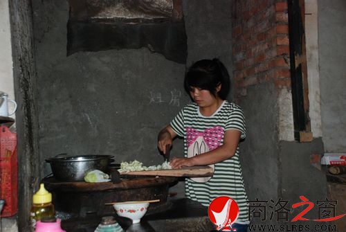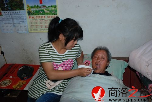6月22日下午,天下著小雨,筆者來(lái)到了位于洛南縣永豐鎮(zhèn)楊村一組的張妮家。我們看到祖孫二人住在一座有些陳舊的三間土房?jī)?nèi),院落雖然有些破舊,屋內(nèi)也沒(méi)有一件像樣的家具,但卻打掃的干干凈凈,室內(nèi)物品也擺放的井井有條,鍋臺(tái)簡(jiǎn)單潔凈。在東側(cè)一間光線有點(diǎn)昏暗的房間土炕上,我們看到,張妮正側(cè)坐在土炕邊沿給臥病在床的奶奶霍琴娃一勺一勺地喂著米粥,還不時(shí)地用毛巾幫奶奶擦著嘴角。
