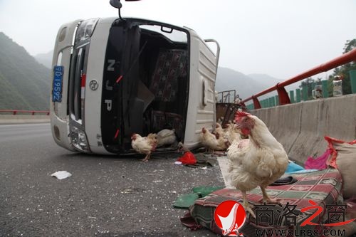 商洛日報訊(記者 楊鑫)7月22日上午九點半左右,一輛滿載肉雞的寧夏牌照小貨車在滬陜高速1339公里丹鳳縣白家灣隧道外高架橋上側(cè)翻,無人員傷亡,但一千多只肉雞大部分甩入橋下喪生。