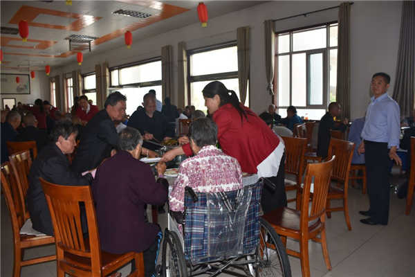 跟著馬院長來到院民就餐大飯?zhí)?,看到偌大的餐廳近200多個院民們已經(jīng)圍坐在20多張餐桌上,職工已經(jīng)開始上菜,上完菜每張桌子就有一位工作人員在一旁招呼,按院里的規(guī)定,院民吃完后員工才能開始就餐。院里每個月都為院民集中過生日,用這些細微周到的關(guān)懷,彰顯敬老扶弱工作的崇高。今天集中過生日加到10個菜,院民們既能吃到時令綠色素菜,也能嘗到像牛肉,燒雞這樣的葷菜,還能吃到他們自己養(yǎng)的豬炮制成的山陽傳統(tǒng)臘肉。馬院長笑著說,院民們都愛吃臘肉,以后要多做一些給他們吃。