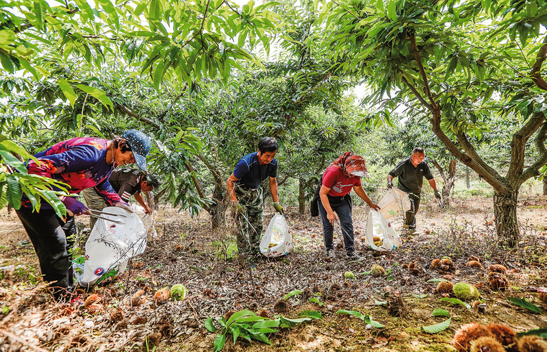 金秋送爽,板栗飄香。9月26日,走進鎮(zhèn)安縣云蓋寺鎮(zhèn)金鐘村板栗種植基地,一片熱鬧的景象映入眼簾。只見村民手持長長的竹竿,仰頭專注地瞄準板栗樹枝頭密密麻麻的栗毛球?!芭九九尽钡穆曧懘似鸨朔?,栗毛球如密集的雨點般簌簌落下,砸在地上,發(fā)出歡快的聲響,地上很快就鋪滿了一層,它們圓滾滾的,似一個個蜷縮起來的小刺猬。有的村民則提著竹籠或拿著布袋,忙著撿拾地上的栗毛球,整個金鐘村板栗種植基地都沉浸在豐收的喜悅之中。