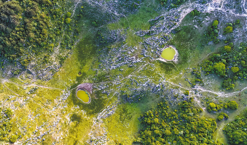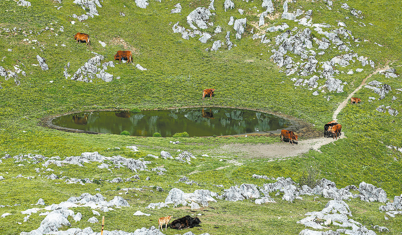 登上北陽山巔向北眺望,能夠領(lǐng)略到逶迤秦嶺的雄渾氣勢,向南遠(yuǎn)望荊楚之地,能夠俯瞰秀麗漢水奔流入天際。整個(gè)山系呈東西走向,山頂是面積200多平方公里的無人區(qū),天坑、溶洞、漏斗等自然景觀星羅棋布。淡灰色的石頭,有的如雄獅般威猛,有的似綿羊般溫順,有的像怪獸般奇特,它們或慵懶地站立,或隨意地躺臥,分布在草甸之上。登高遠(yuǎn)望,仿佛是埋伏著的千軍萬馬,氣勢恢宏。