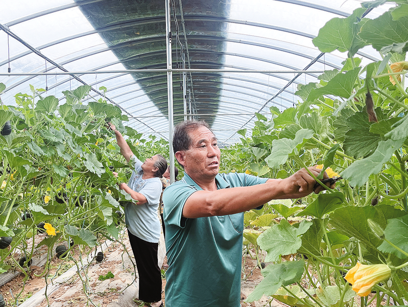 △分裝車間內,工人正在進行水果番茄分揀和包裝作業(yè)。?村民在高山有機蔬菜產業(yè)園內給貝貝南瓜藤掐蔓。