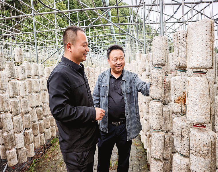 9月19日,西華村黨支部書記石立柱(右)在木耳基地查看木耳生長(zhǎng)情況。