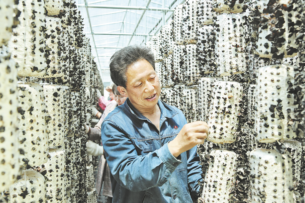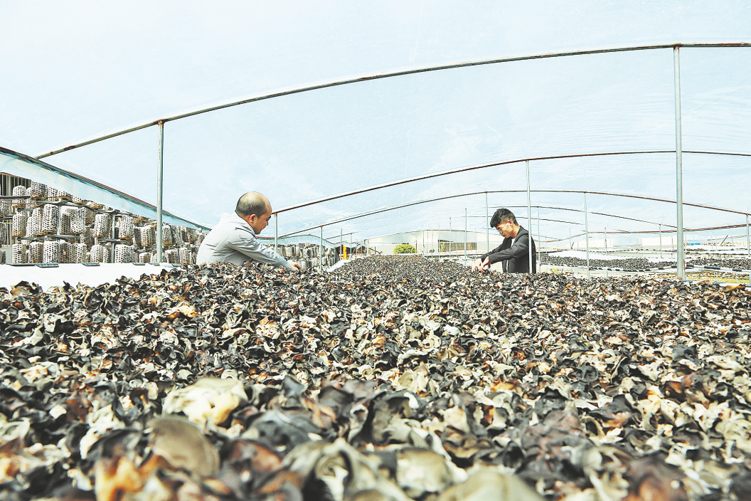 在金米村木耳大棚,村民鄒勝全和請(qǐng)來的幫工正在采摘木耳。