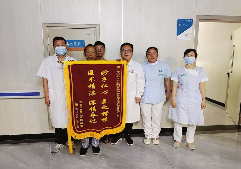 柞水一位消化道穿孔、感染性休克的極度危重病人,經(jīng)過高淳醫(yī)院幫扶專家陳勇(右三)手術(shù)和術(shù)后30多天的精心救治后康復(fù)出院,復(fù)診時和家人一起送來錦旗表達(dá)感激之情。
