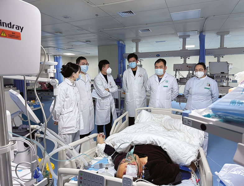 2023年,在南京“組團(tuán)式”幫扶醫(yī)療隊幫助下,柞水縣醫(yī)院開設(shè)了重癥醫(yī)學(xué)科。圖為南京鼓樓醫(yī)院幫扶專家皮陽(右二)在重癥監(jiān)護(hù)室利用早查房開展教學(xué)。